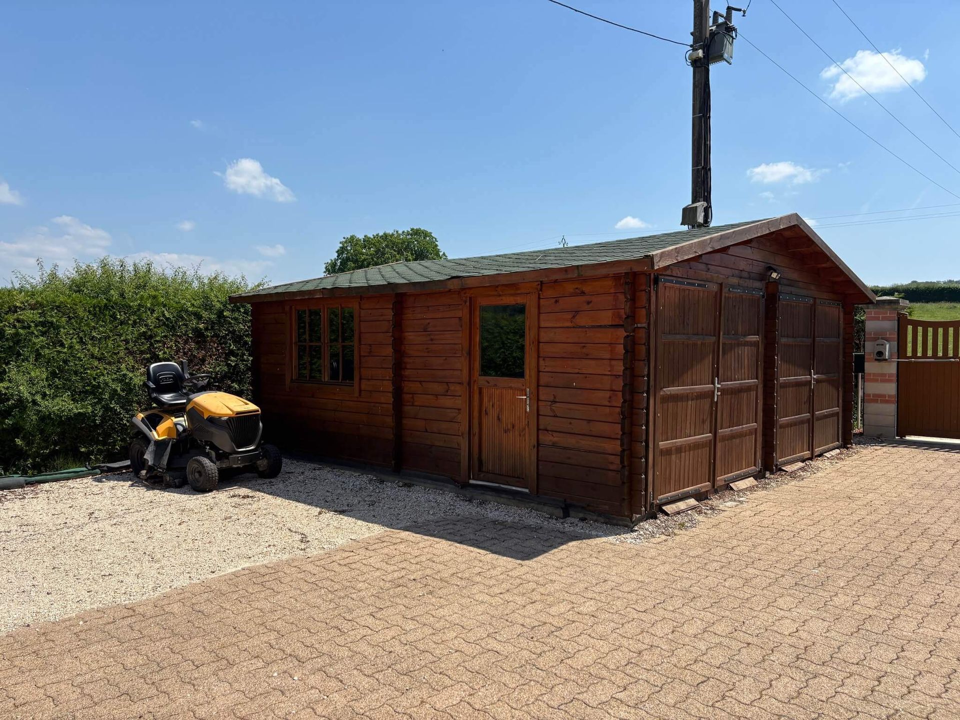 Im Außenbereich befindet sich eine große Doppelgarage aus Holz mit Platz für zwei PKW, ein geräumiger Hundezwinger sowie ein Unterstand für einen John Deere Caddy.