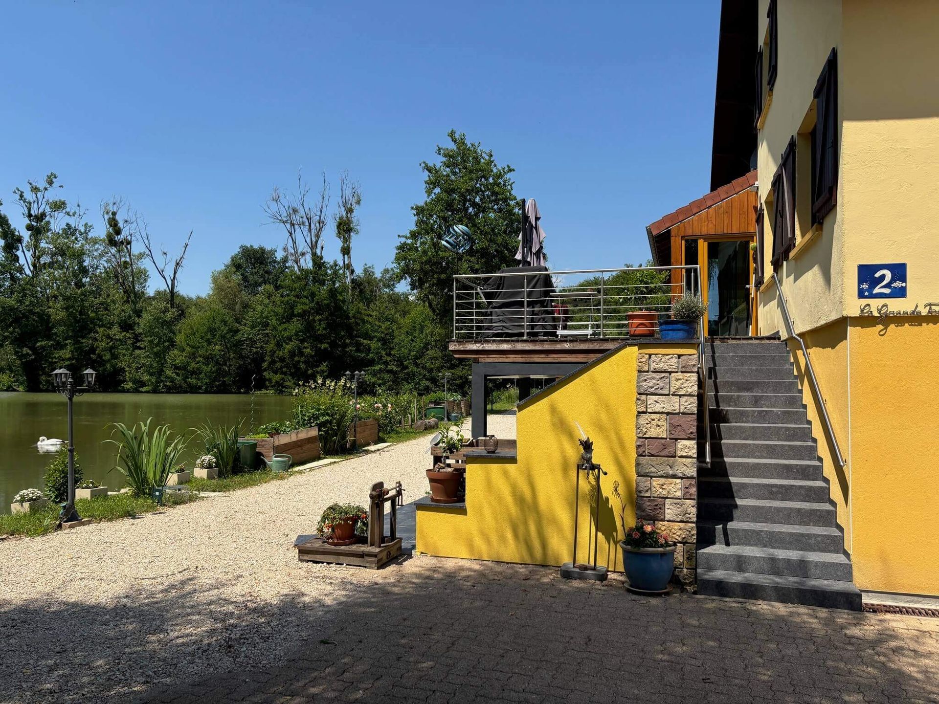 Die Vorderseite des Grundstücks ist mit Parklampen eingefasst. Am vorderen See befindet sich in Hausnähe ein Steg, von dem aus mit dem vorhandenen Ruderboot Ausflüge möglich sind – besonders attraktiv für Familien mit Kindern.