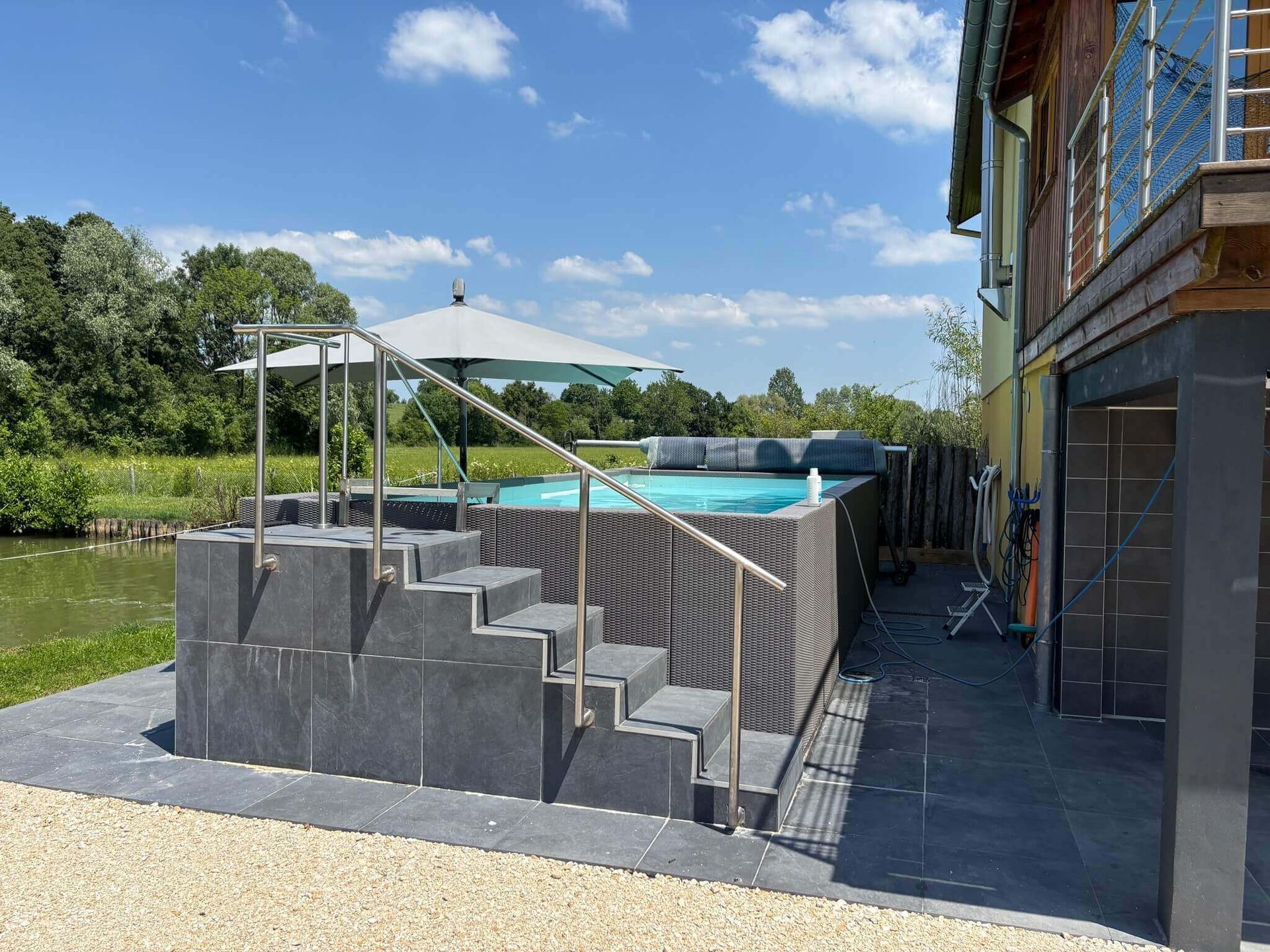 Das beheizte Schwimmbad ist mit einer Solarabdeckung ausgestattet, die entsprechende Schwimmbadausstattung ist vorhanden. Zudem stehen zahlreiche Gartengeräte zur Verfügung.