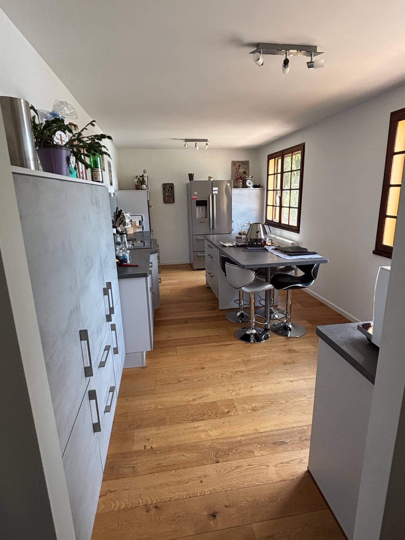 Große, voll ausgestattete Küche mit Thekentisch und Barhockern. Ausgestattet mit Induktionsherd, Backofen sowie einem Side-by-Side-Kühlschrank mit Eiswürfelauswurf.